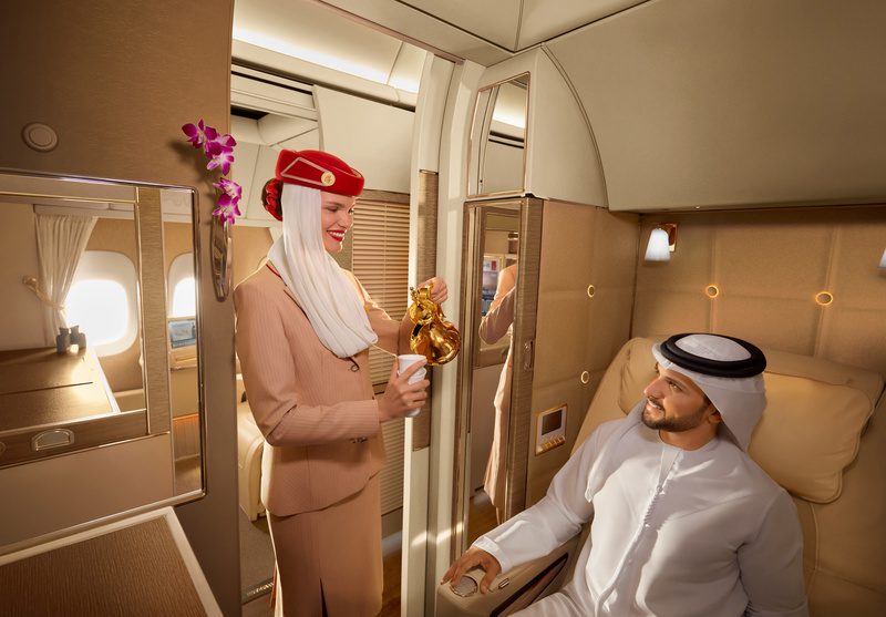 A Emirates serve mais de 130 mil quilos de café a bordo a cada ano e oferece sua própria mistura exclusiva de café árabe em colaboração com o produtor local artesanal, Mattina.