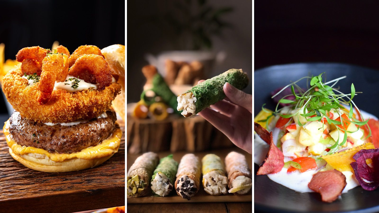Hambúrguer Surf’N turf de Wagyu do Koburger, Cannoli Deu samba! da Cannoleria Farinha Flor e Ceviche de Caju do Cão Véio