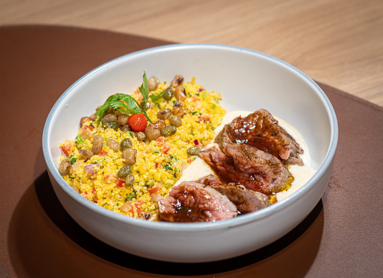 Nos principais, o Arroz de Pernil com Creme de Pimentão e o Baião Vegetariano traduzem um pouco a essência da casa, assim como o Cuscuz Sagratto, com pirão de leite e tagliata de filet mignon ao demi glace.